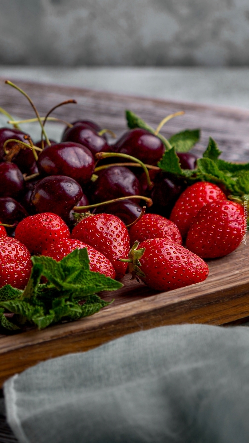 Edytor tapety: Truskawki i czereśnie na desce