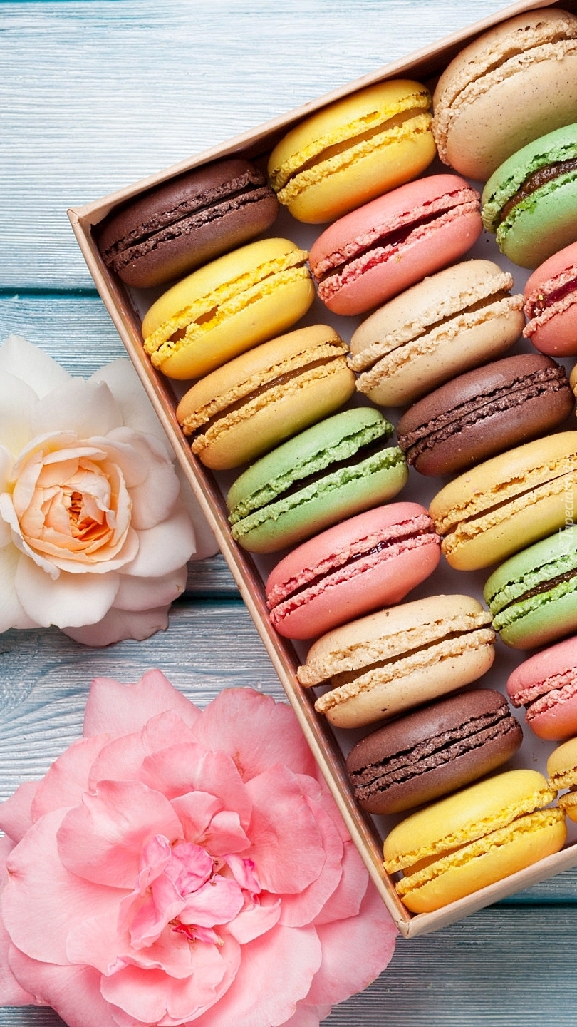Edytor tapety: Makaroniki w pudełku obok róż