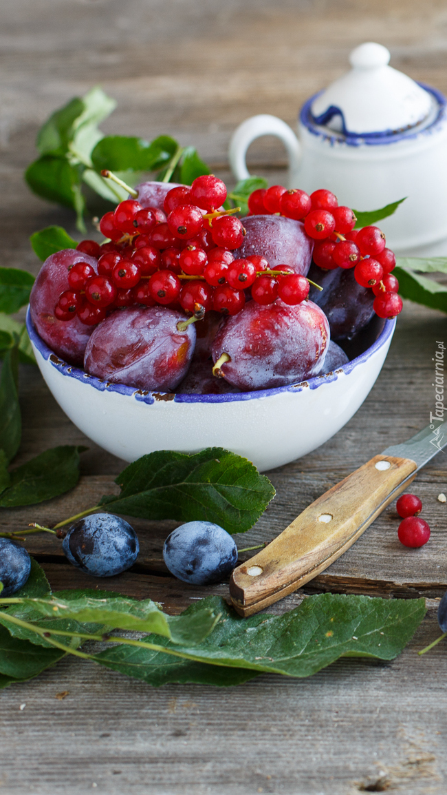 Edytor tapety: Miska ze śliwkami i porzeczkami