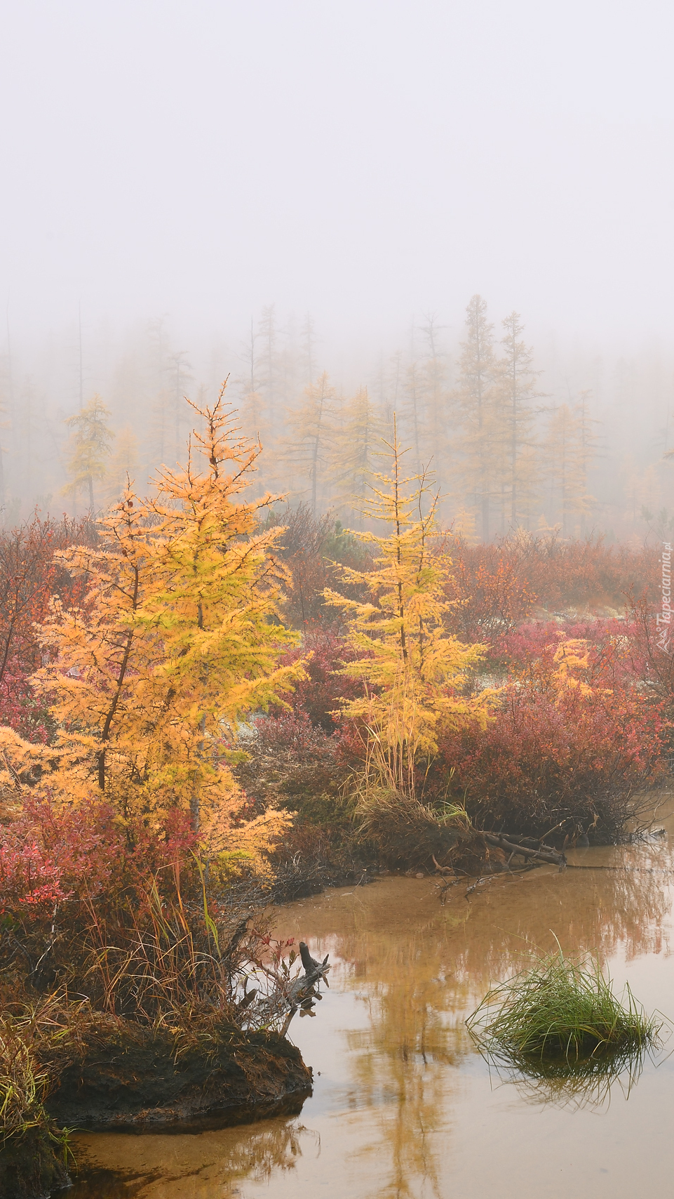 Edytor tapety: Drzewa we mgle nad jeziorem