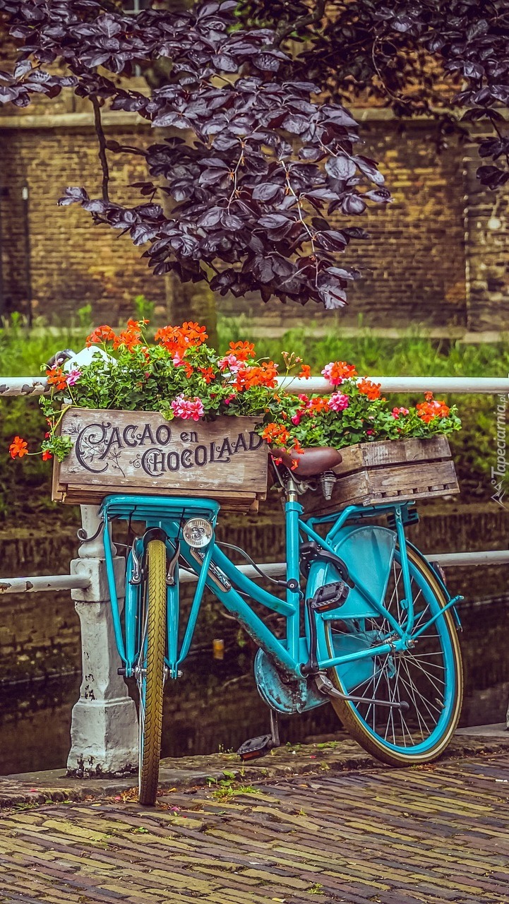 Edytor tapety: Niebieski rower ze skrzynkami kwiatów