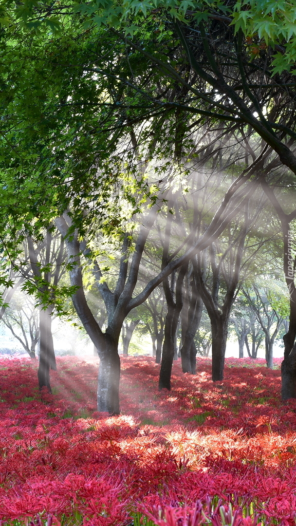 Edytor tapety: Czerwone kwiaty pod drzewami