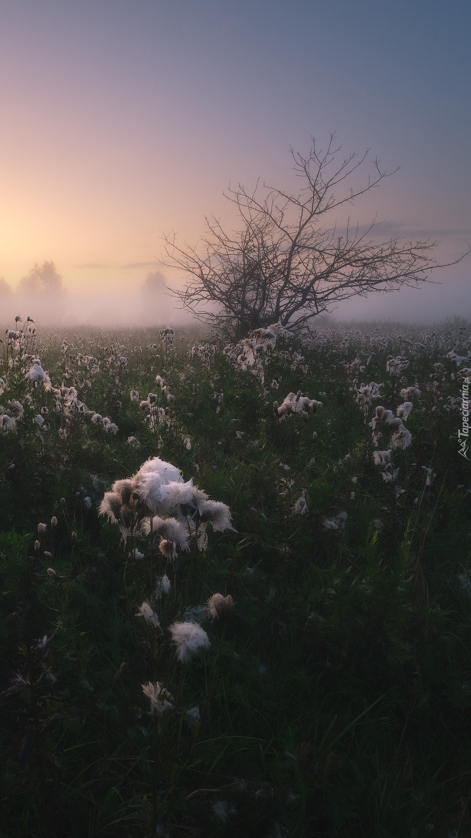 Edytor tapety: Poranek nad zamgloną łąką