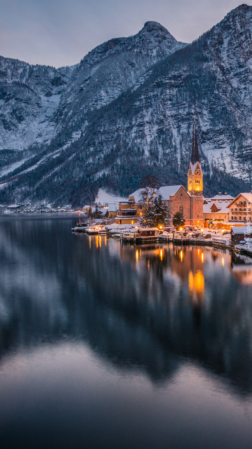 Edytor tapety: Oświetlone miasteczko Hallstatt zimą