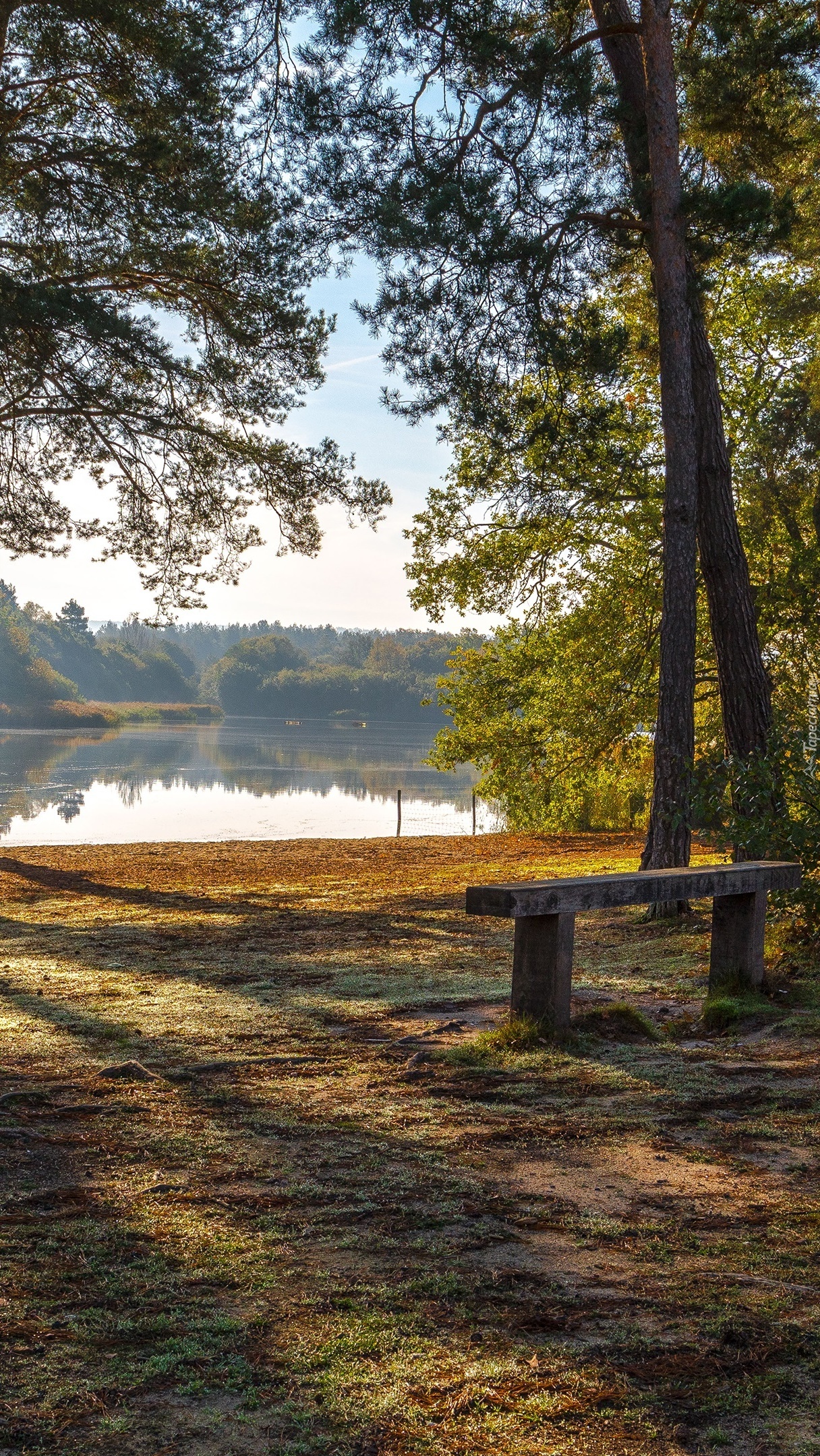 Edytor tapety: Ławka pod drzewami nad rzeką