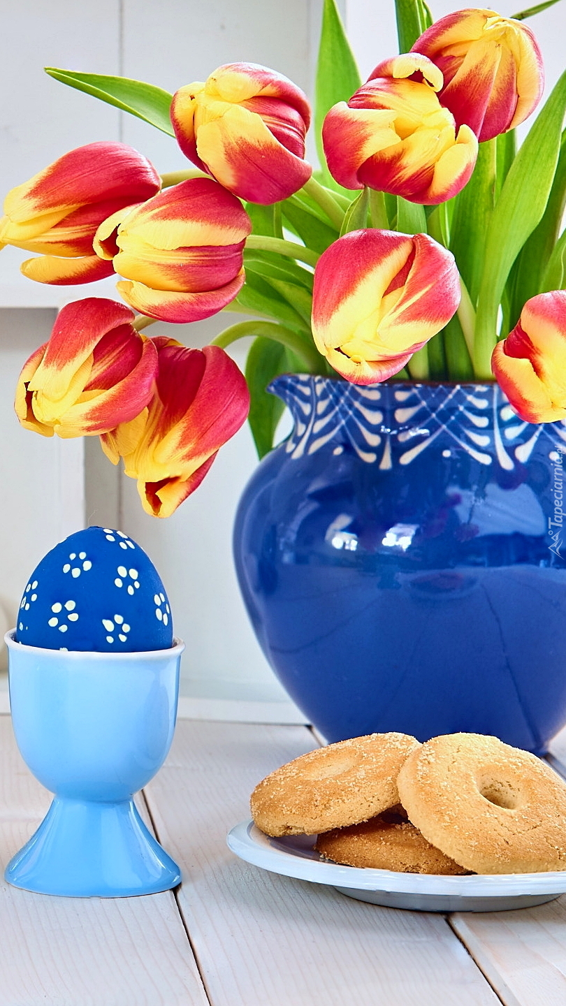 Edytor tapety: Pisanka obok wazonu z tulipanami