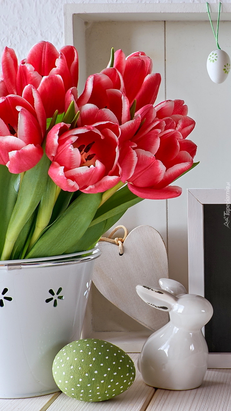 Edytor tapety: Dekoracja wielkanocna obok wazonu z tulipanami