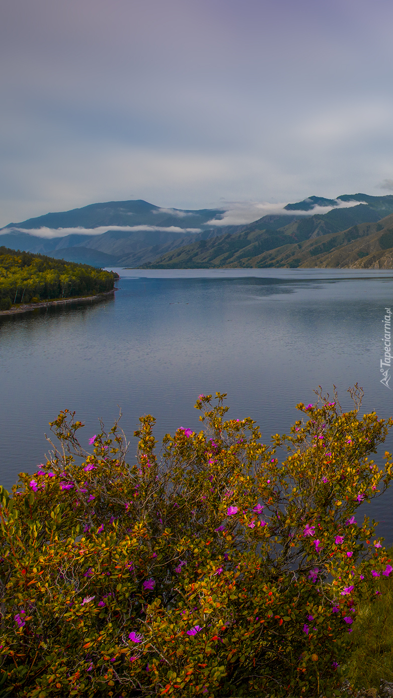 Edytor tapety: Kwitnące krzewy nad jeziorem
