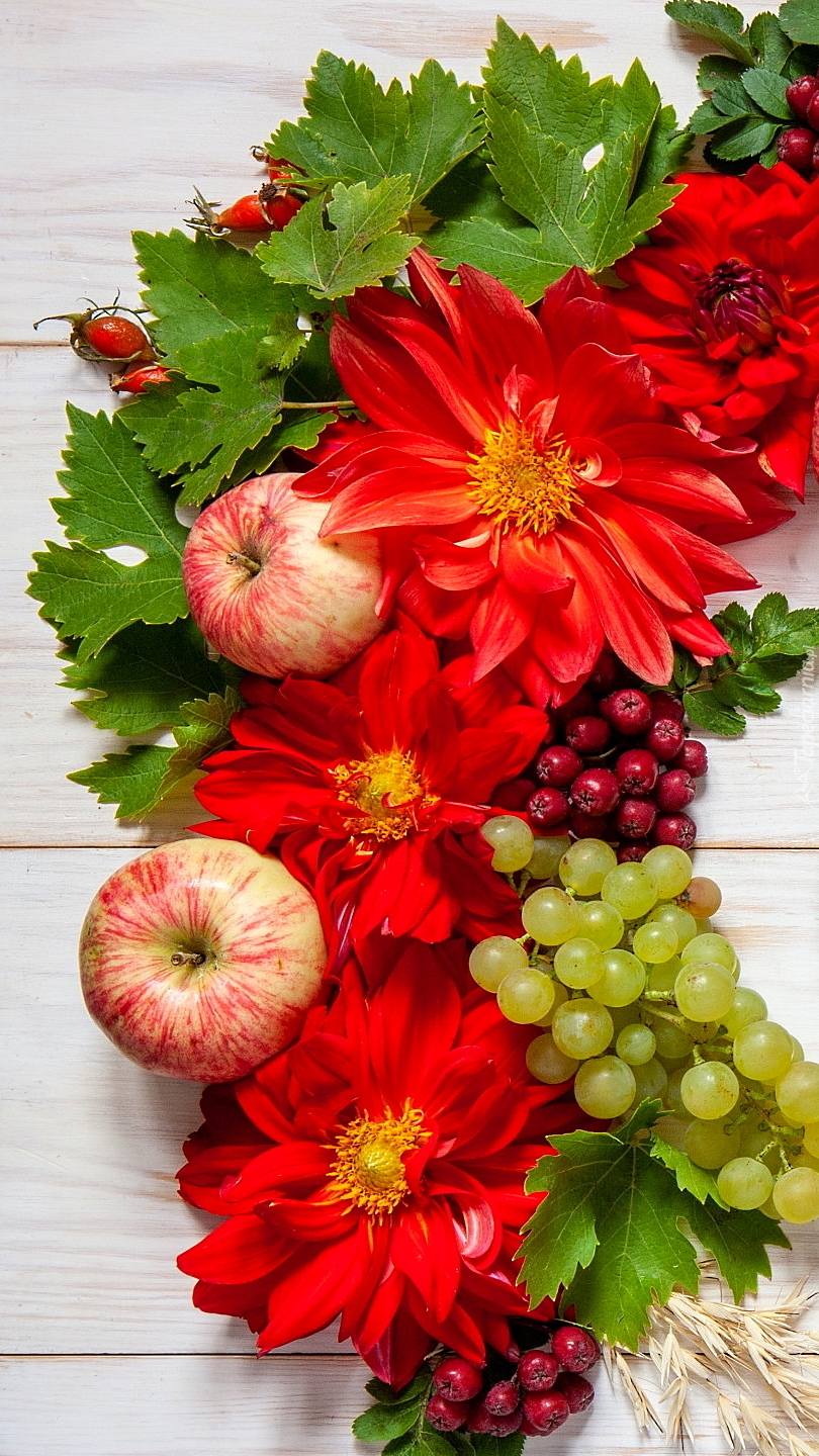 Edytor tapety: Jabłka na czerwonych kwiatach