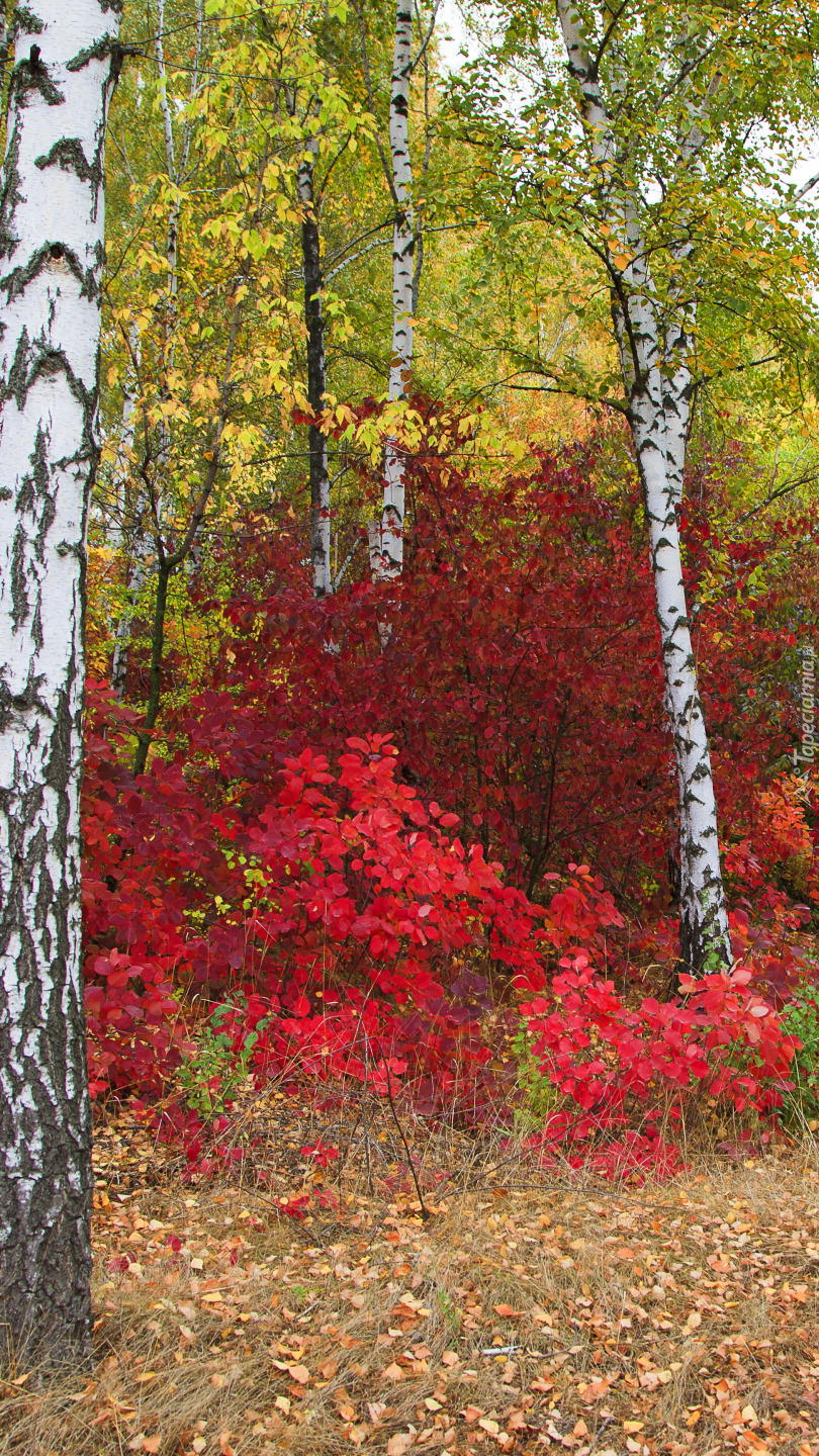 Edytor tapety: Czerwone krzewy pod brzozami
