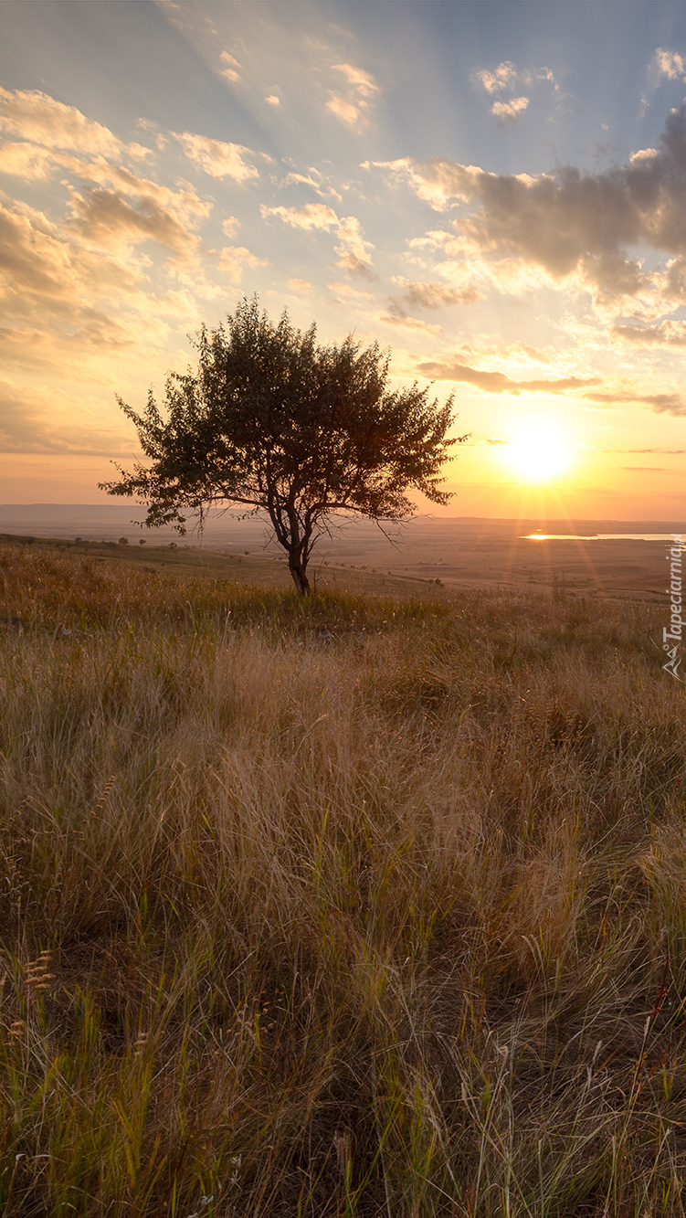 Edytor tapety: Drzewo na łące w promieniach słońca