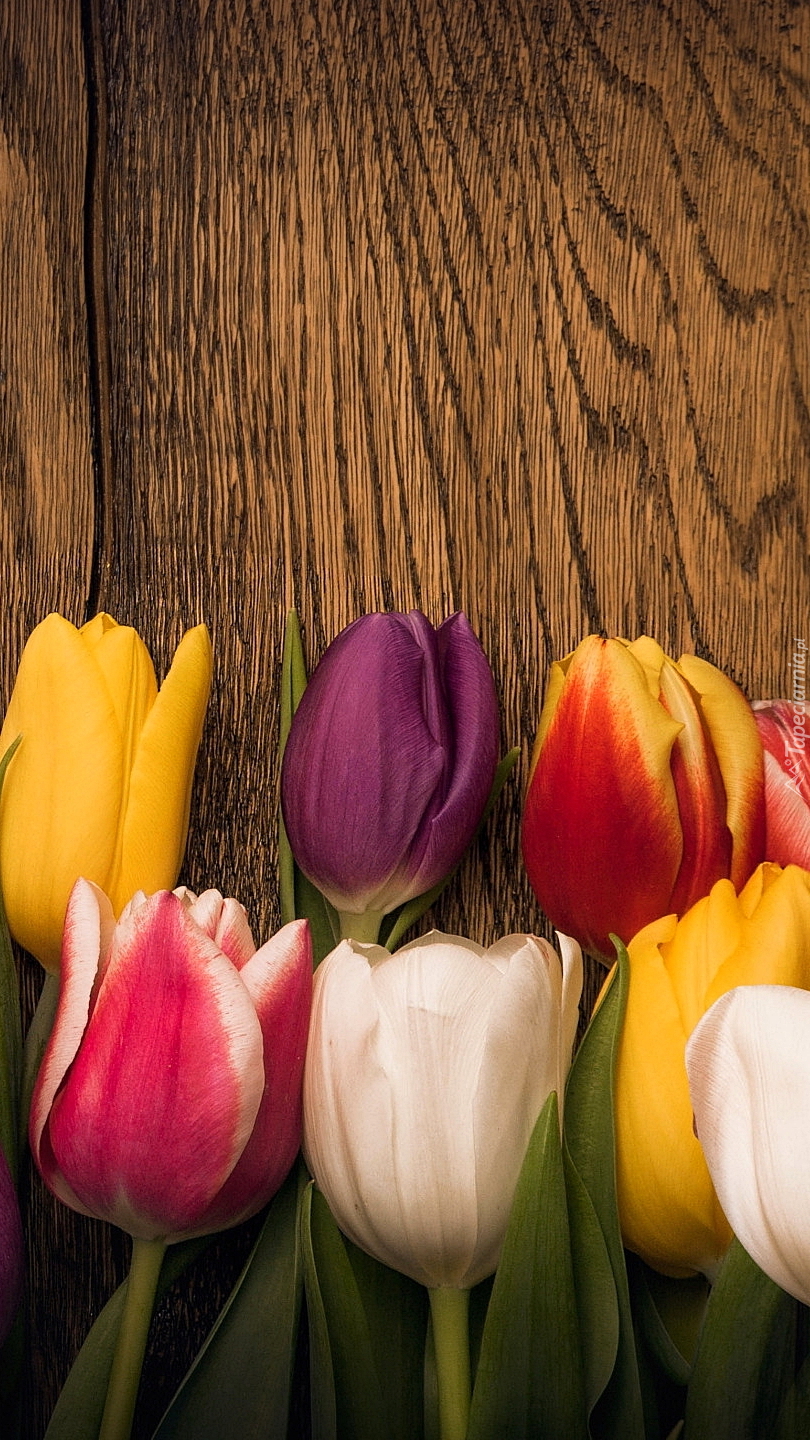Edytor tapety: Kolorowe tulipany na drewnie
