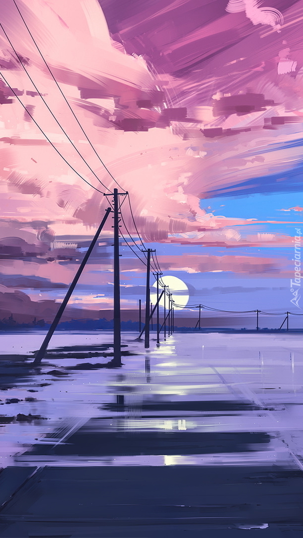 Edytor tapety: Różowe chmury nad jeziorem w grafice