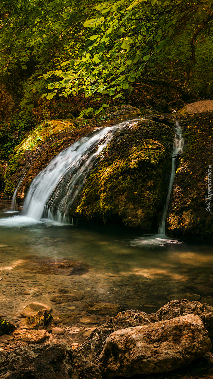 Edytor tapety: Wodospad na skałach w lesie