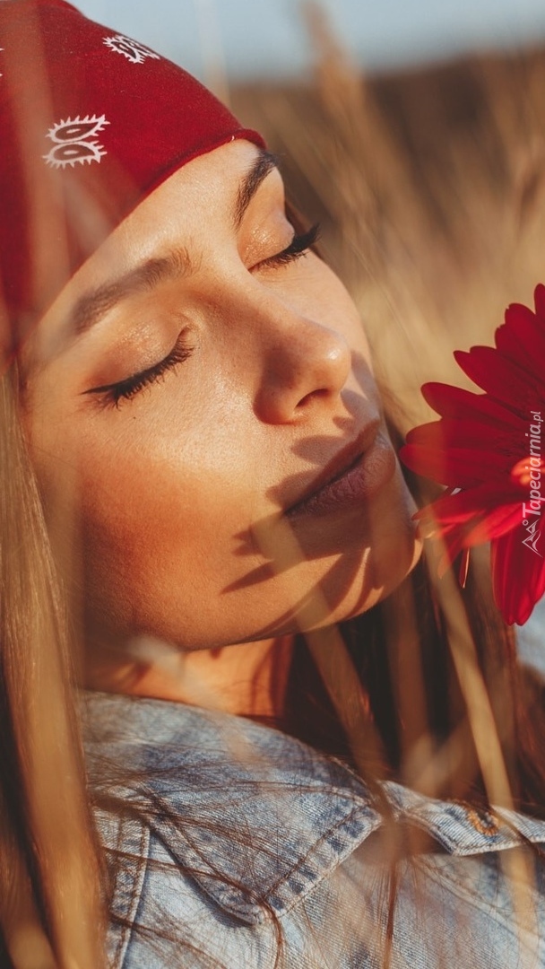 Edytor tapety: Dziewczyna w czerwonej chustce i kwiatem