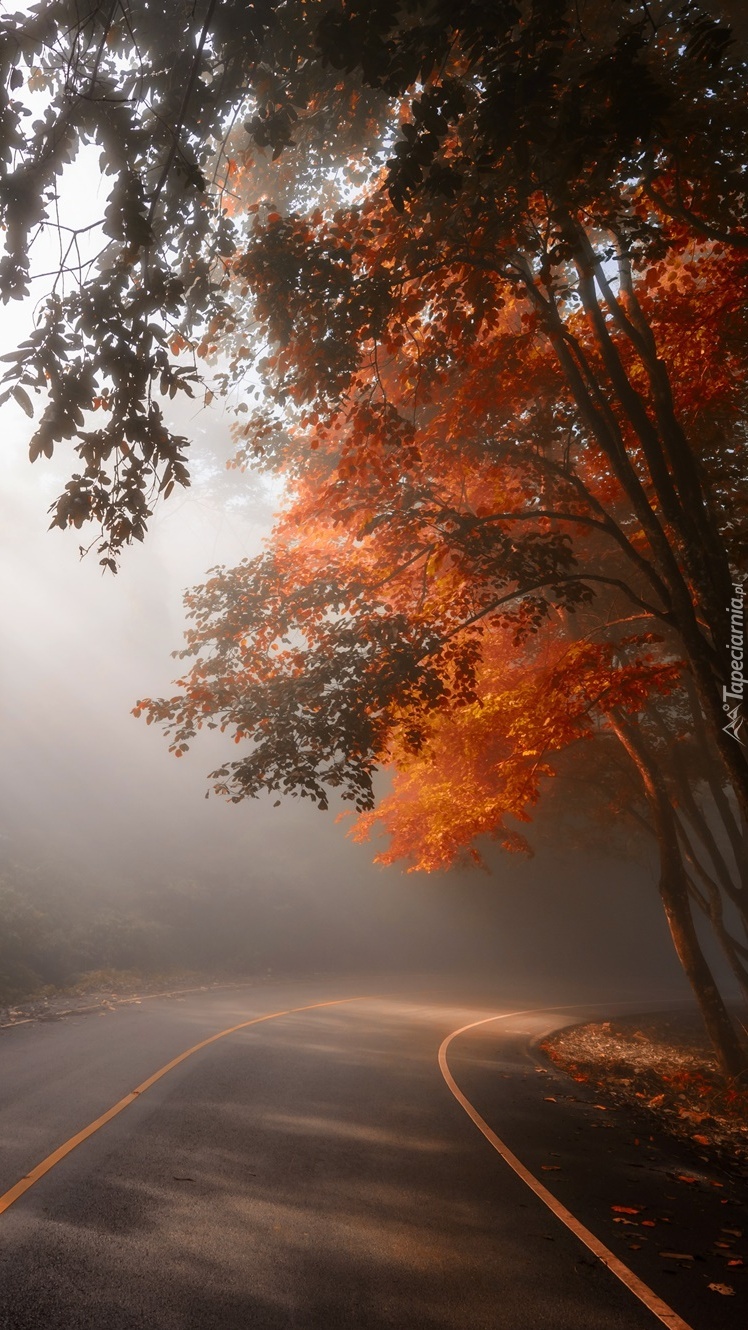 Edytor tapety: Jesienne drzewa we mgle przy drodze