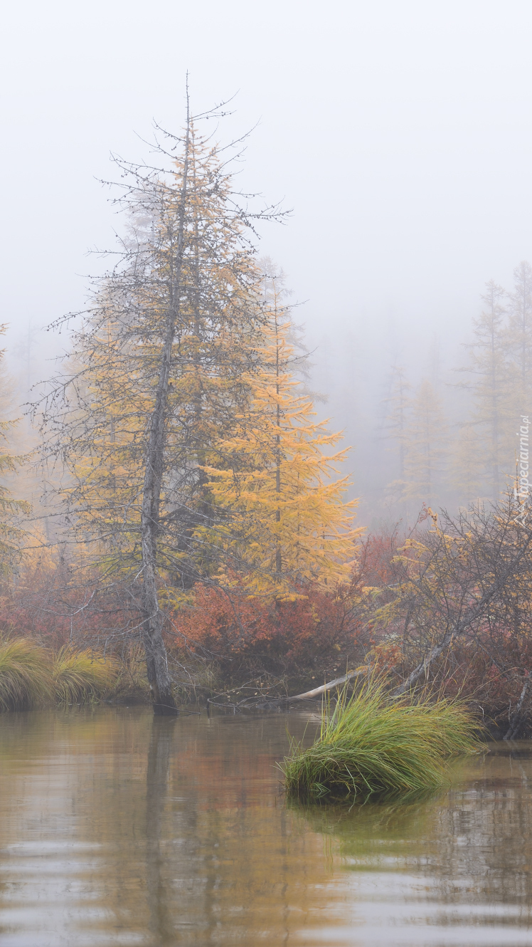 Edytor tapety: Zamglone drzewa nad jeziorem