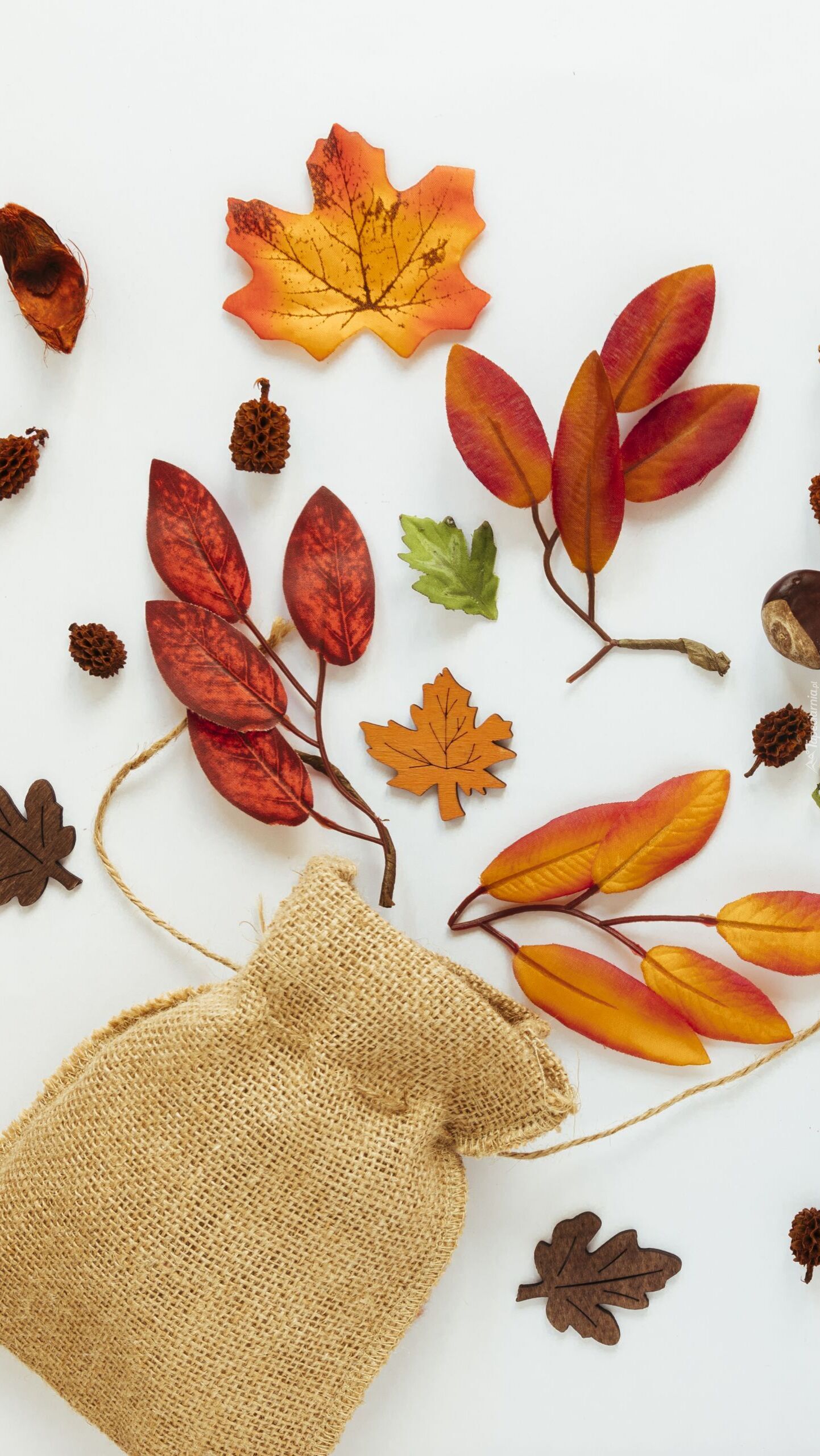 Edytor tapety: Jesienne liście obok woreczka
