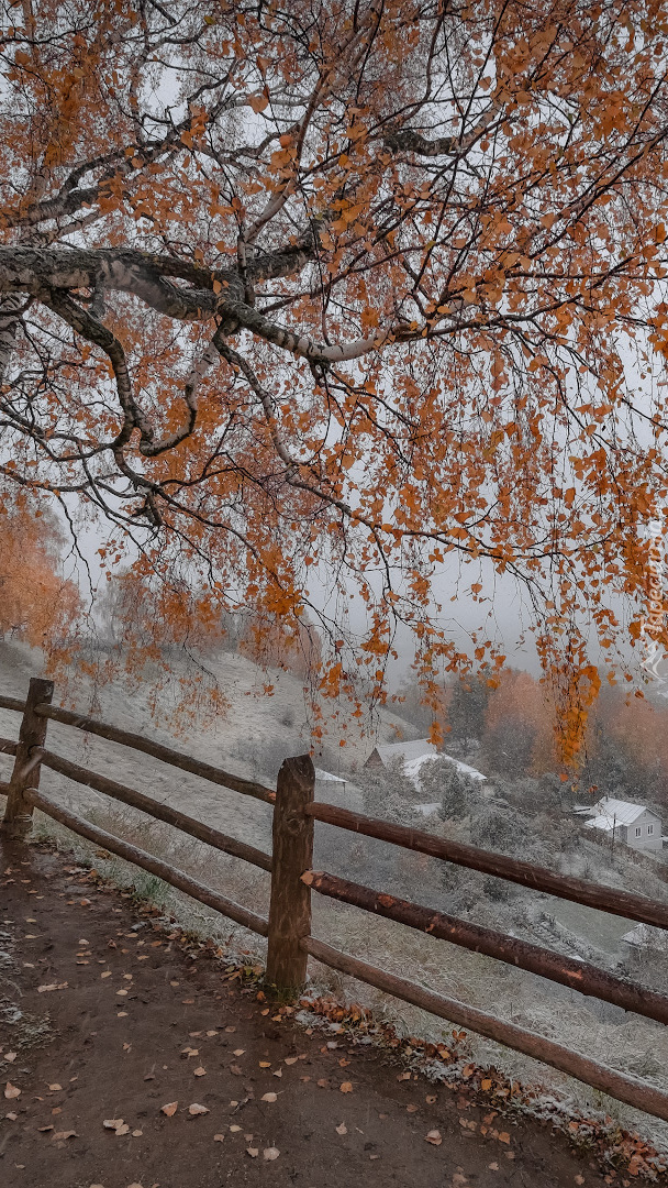 Edytor tapety: Jesienne drzewo przy ogrodzeniu