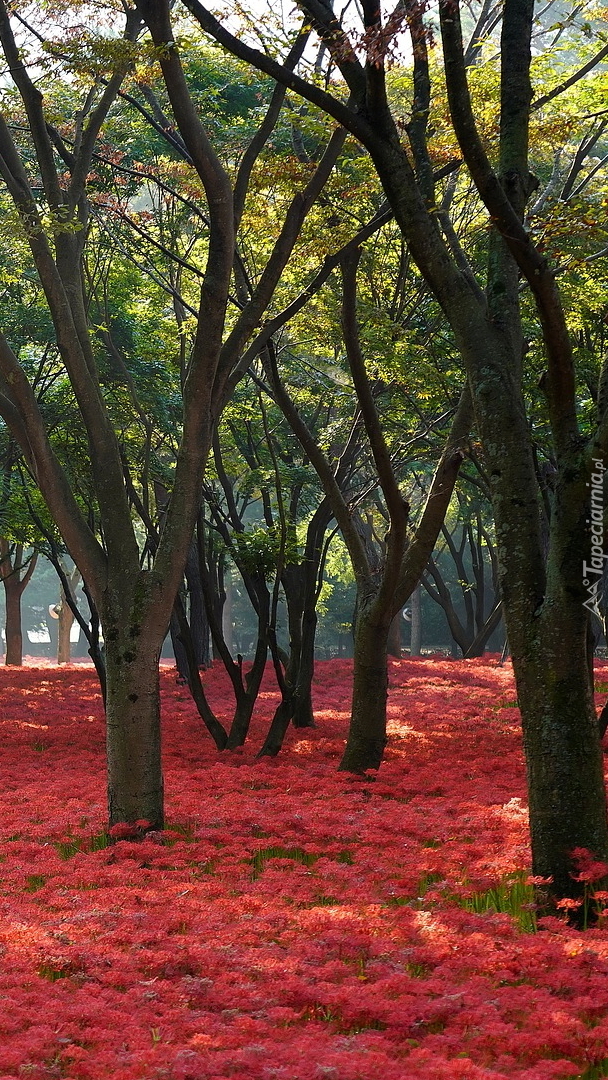 Edytor tapety: Czerwone kwiaty pod drzewami w parku
