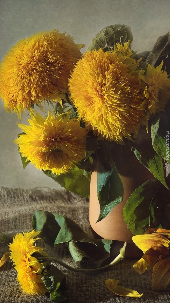 Edytor tapety: Słoneczniki karłowe w wazonie