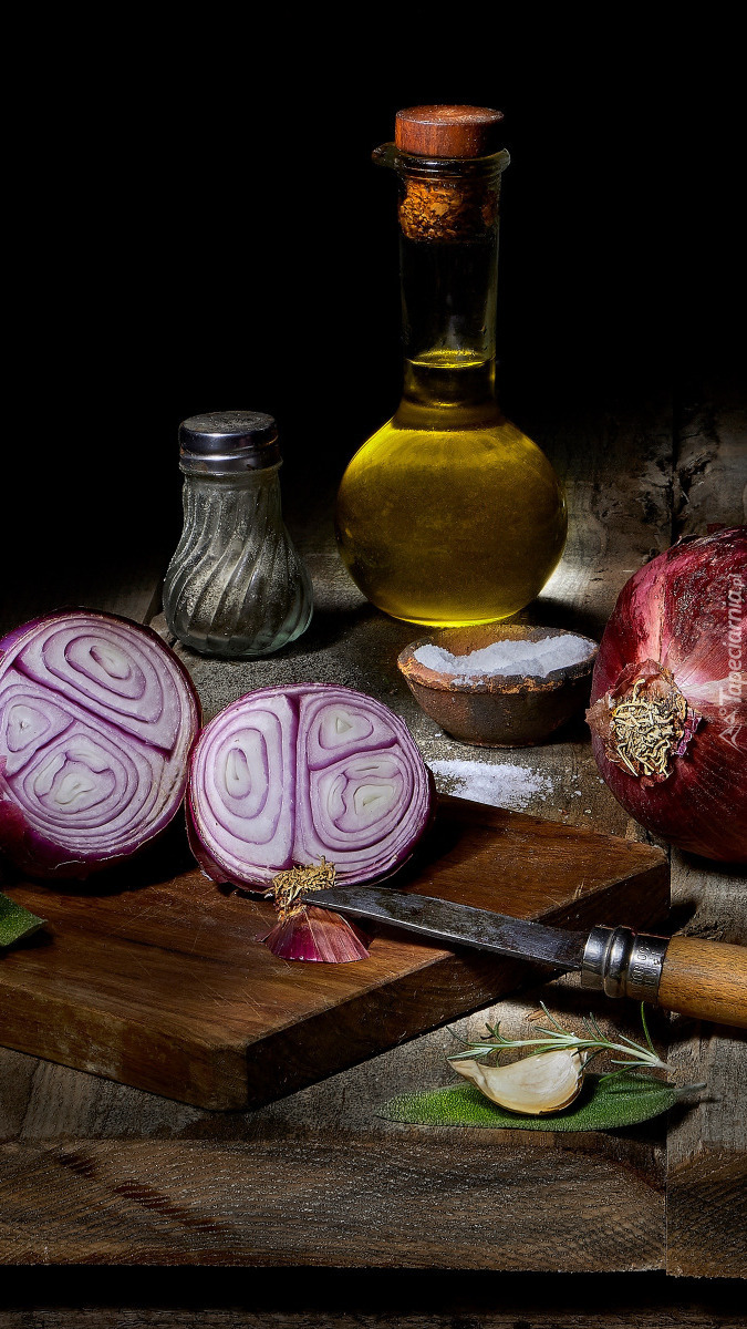 Edytor tapety: Czerwona cebula obok buteleczki z oliwą