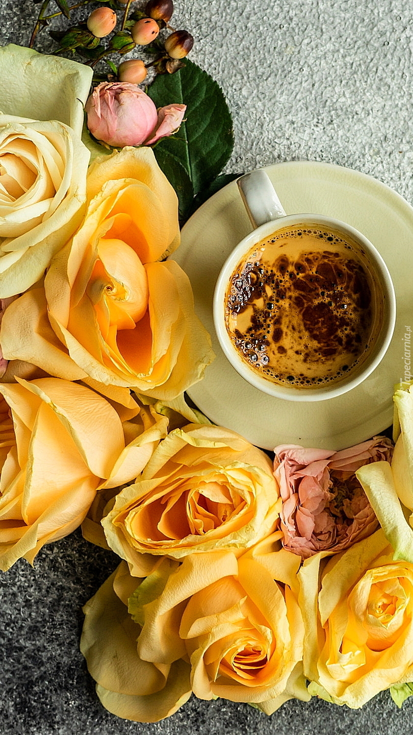 Edytor tapety: Filiżanka z kawą obok żółtych róż