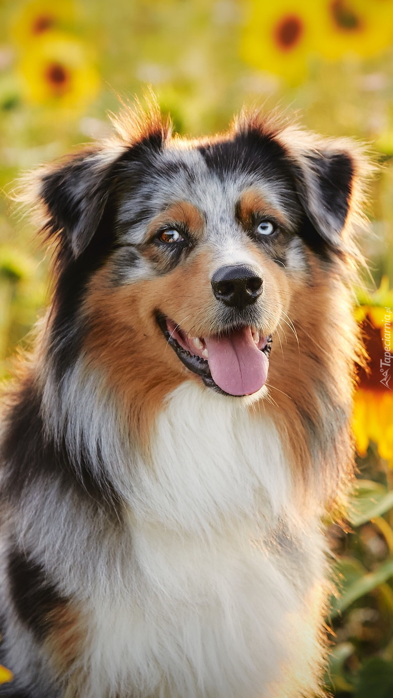 Edytor tapety: Owczarek australijski na tle słoneczników