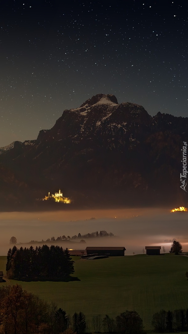 Edytor tapety: Gwiaździste niebo nad zamglonym jeziorem Forggensee