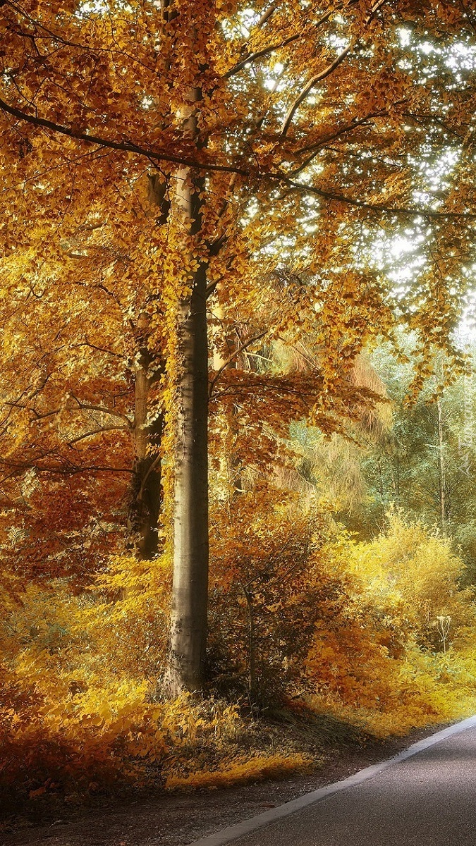 Edytor tapety: Jesienne drzewo przy drodze