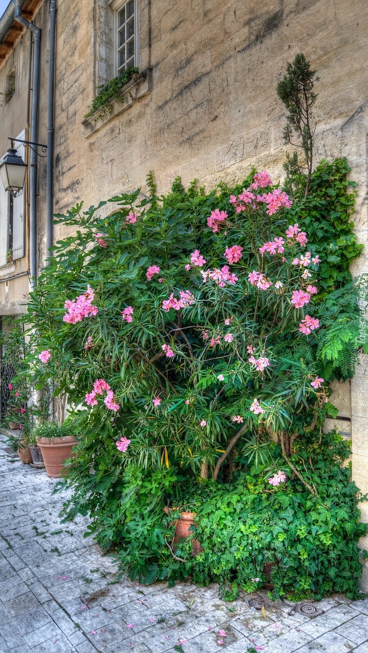 Edytor tapety: Ozdobne krzewy przy ścianie domu