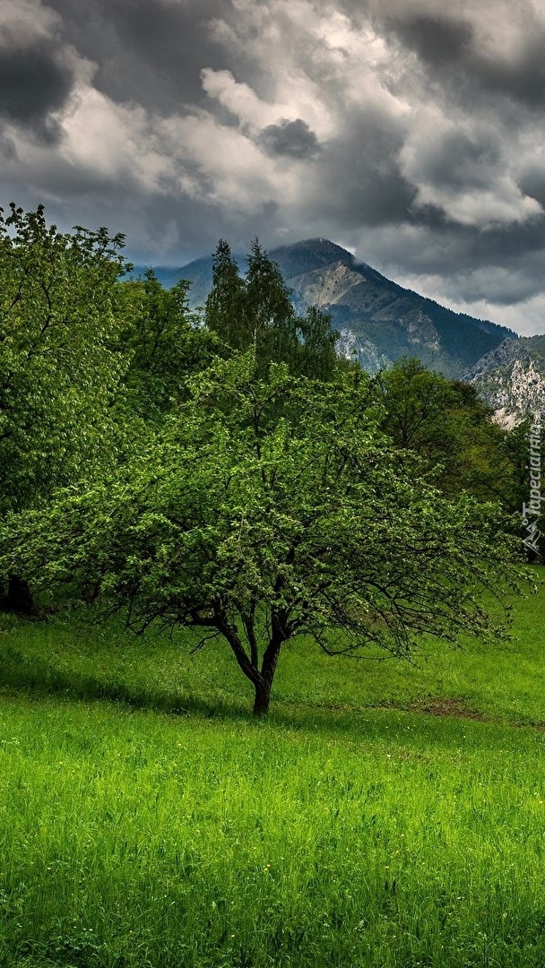Edytor tapety: Zielone drzewa na tle gór