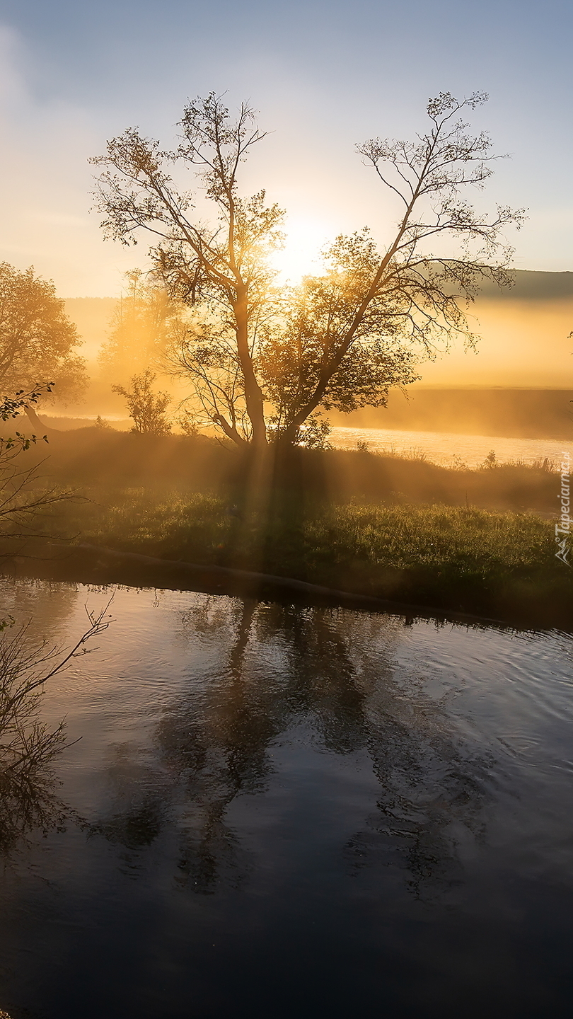 Edytor tapety: Drzewo nad rzeką w słonecznym blasku