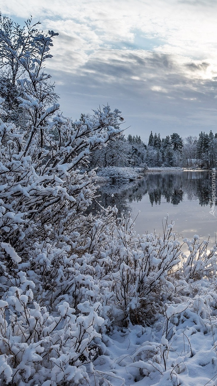 Edytor tapety: Ośnieżone drzewa nad jeziorem