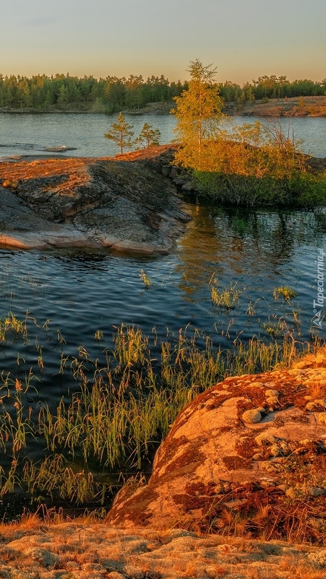 Edytor tapety: Drzewa na skałach w jeziorze