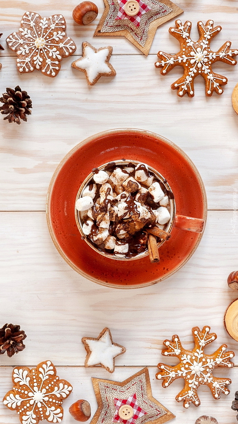 Edytor tapety: Kubek z czekoladą pośród świątecznych pierników