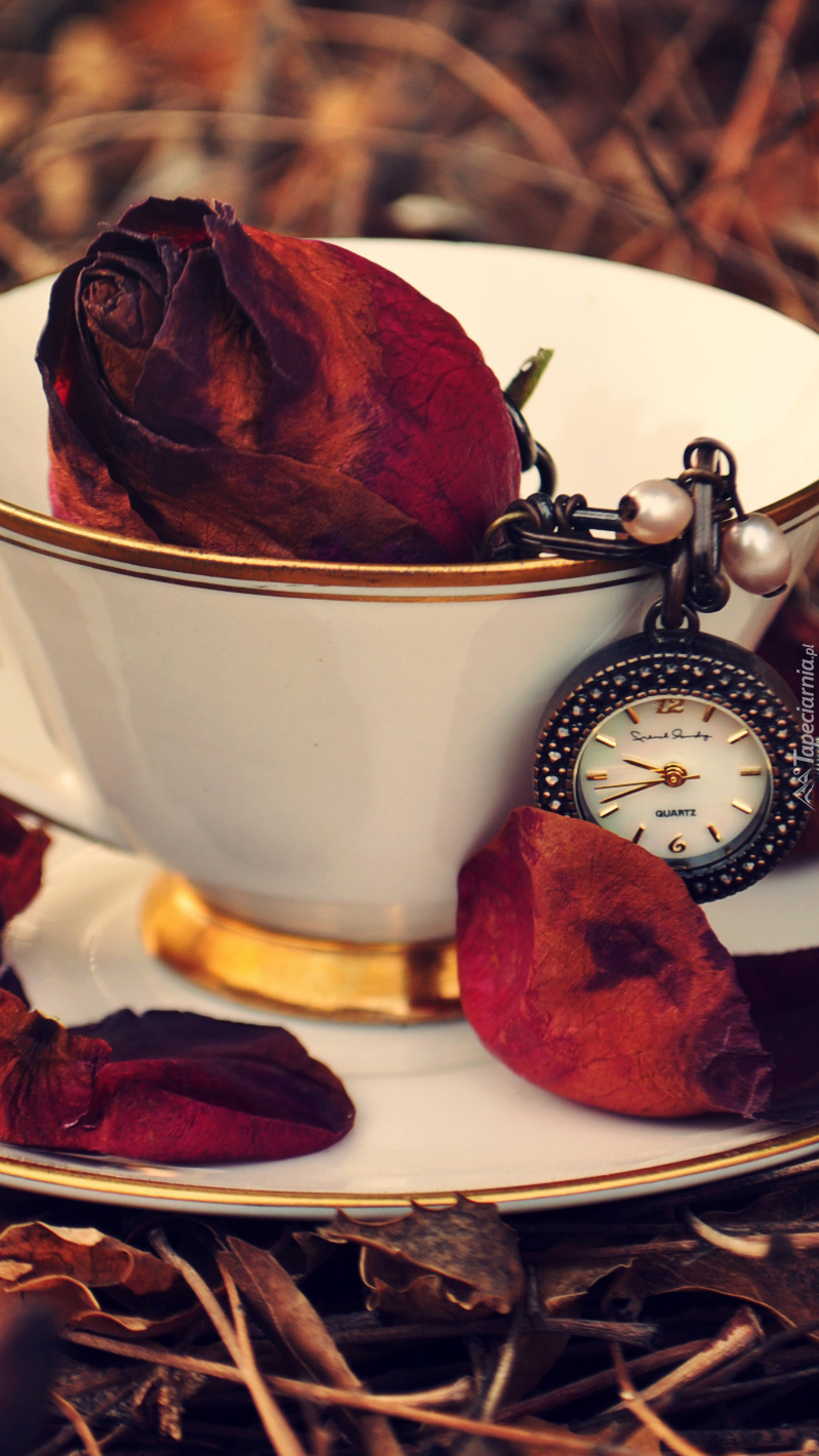 Edytor tapety: Pąk róży i zegarek w filiżance