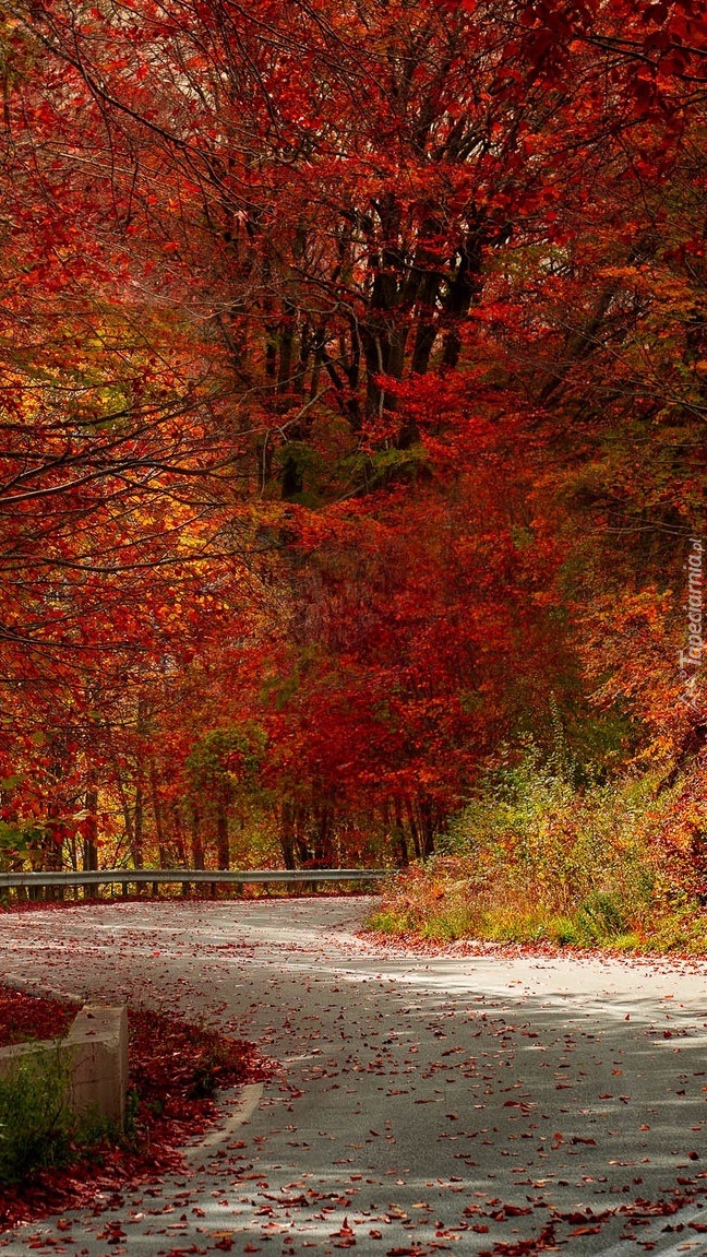 Edytor tapety: Drzewa z czerwonymi liśćmi przy drodze