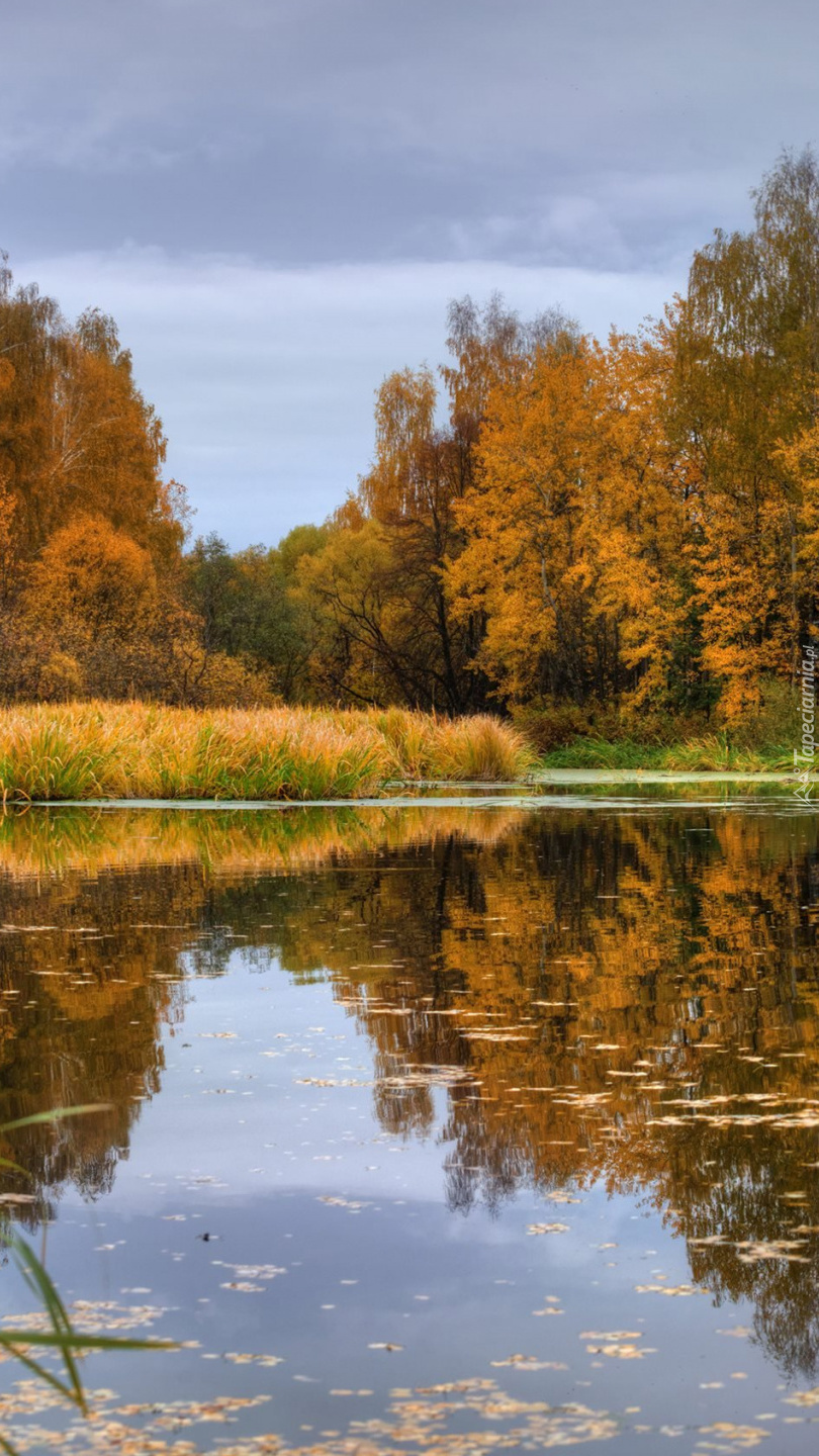 Edytor tapety: Jesienne drzewa i trawy nad jeziorem