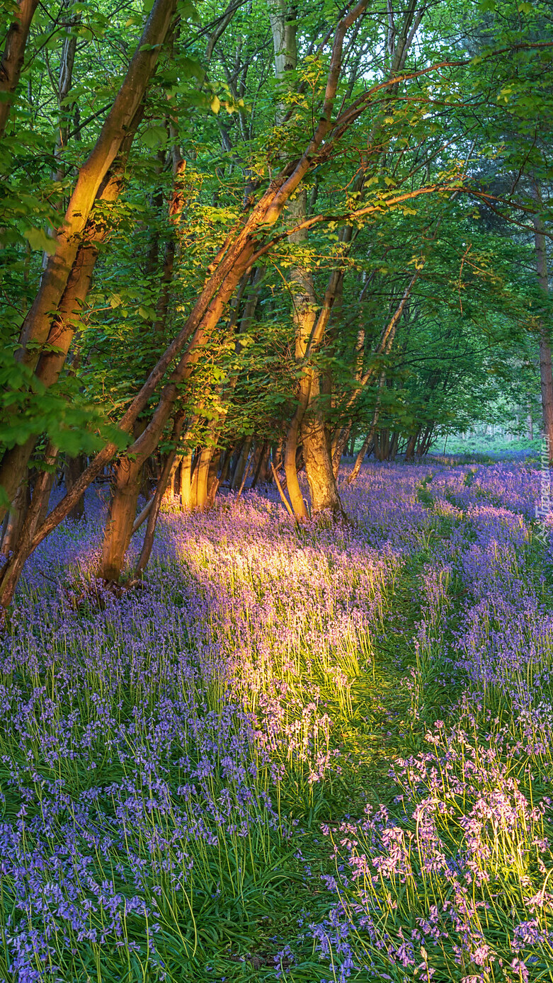 Edytor tapety: Fioletowe kwiaty pod drzewami w lesie