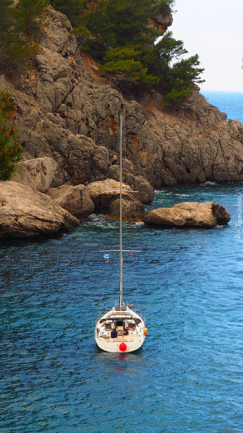 Edytor tapety: Żaglówka obok skał na brzegu morza