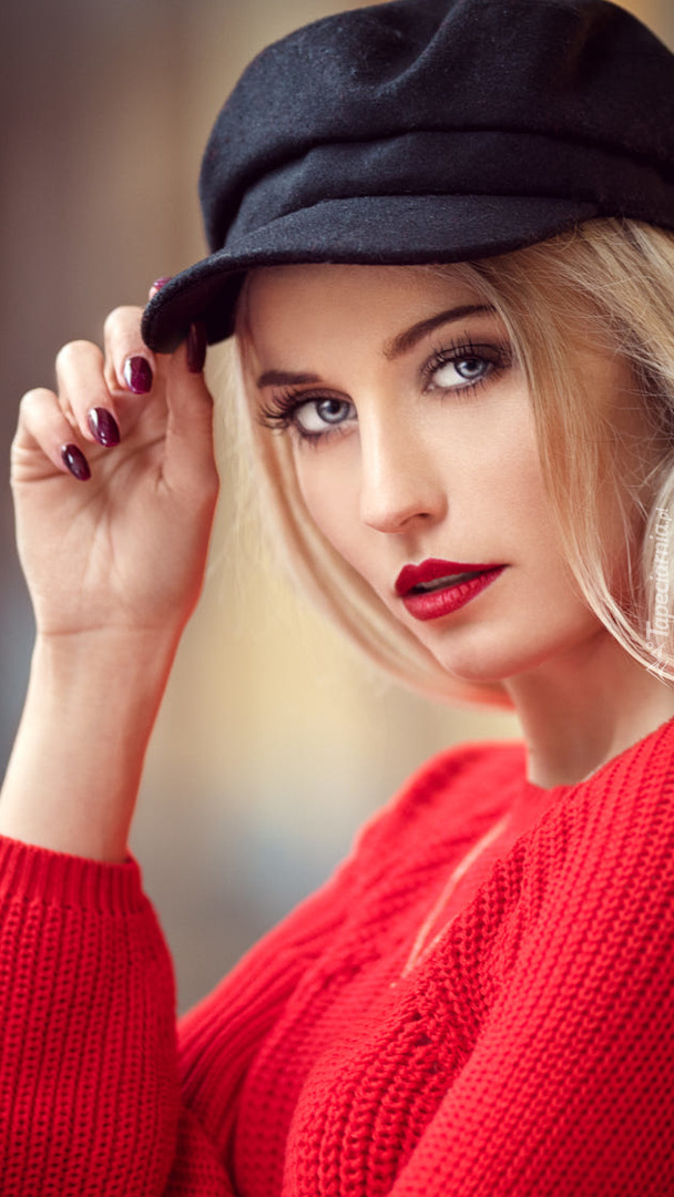 Edytor tapety: Kobieta w czerwonym sweterku i czapce