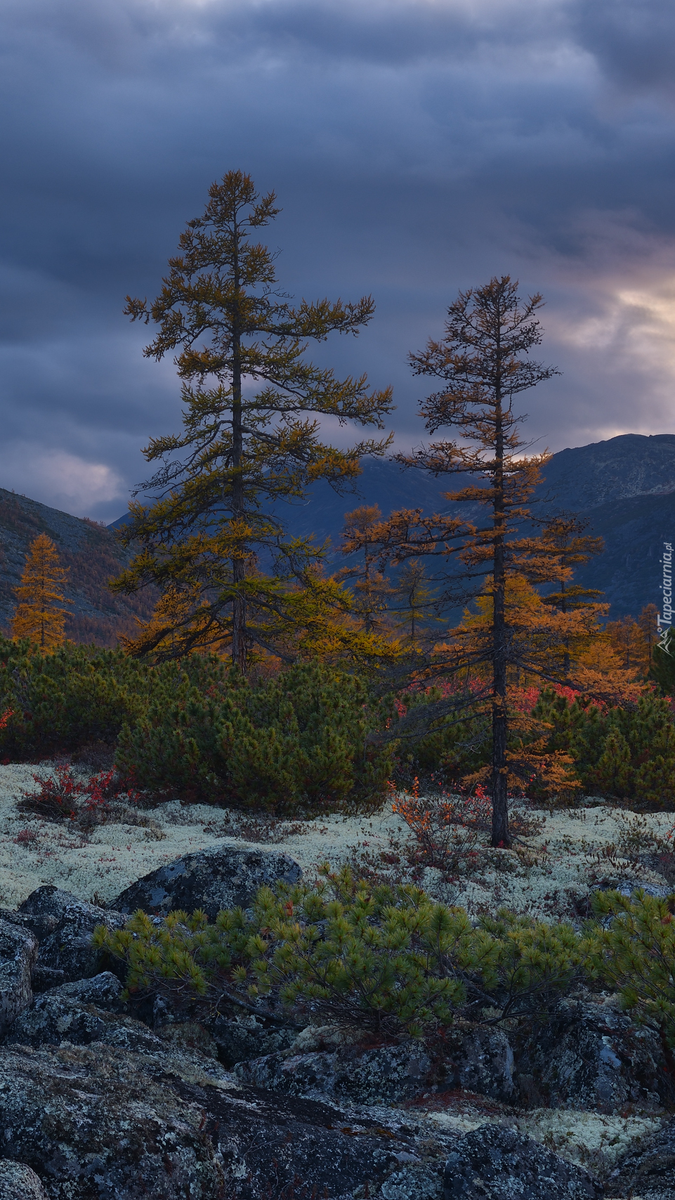 Edytor tapety: Drzewa pod zachmurzonym niebem