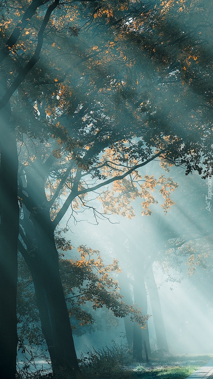 Edytor tapety: Promienie słoneczne wśród drzew w lesie