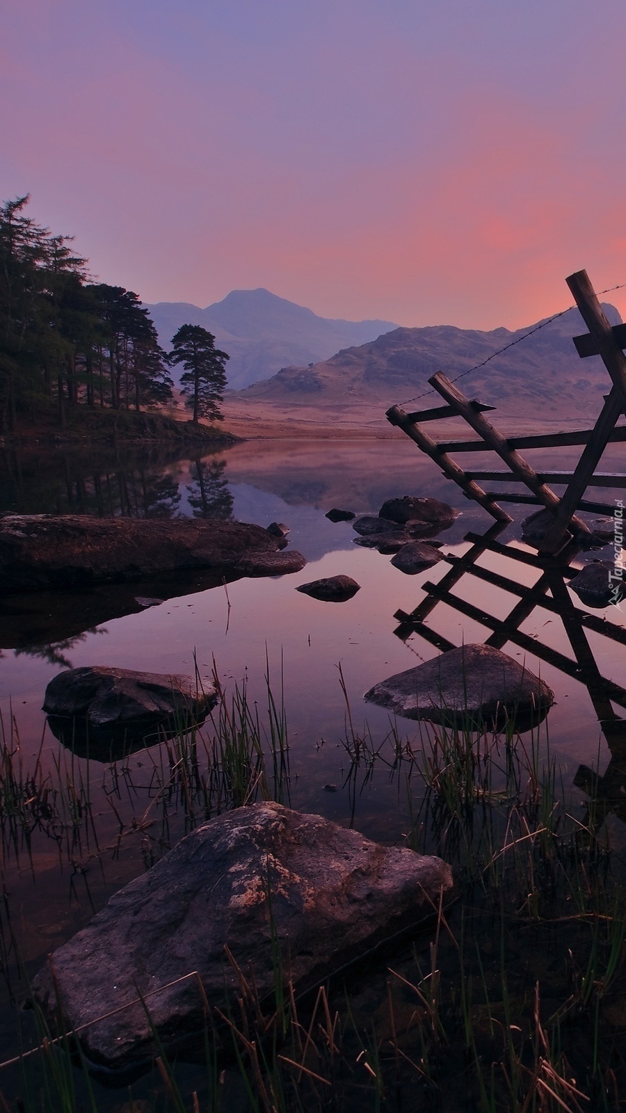 Edytor tapety: Ogrodzenie i kamienie w jeziorze