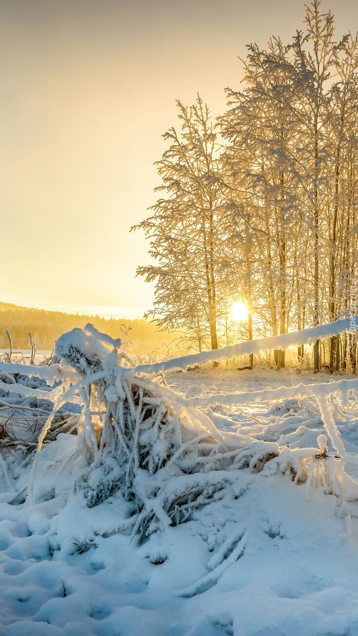 Edytor tapety: Wschodzące słońce wśród ośnieżonych drzew