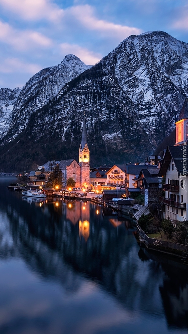 Edytor tapety: Oświetlone domy nad jeziorem Hallstattersee
