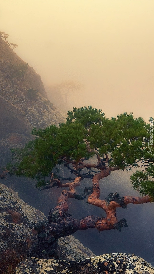 Edytor tapety: Pochylona sosna na skale