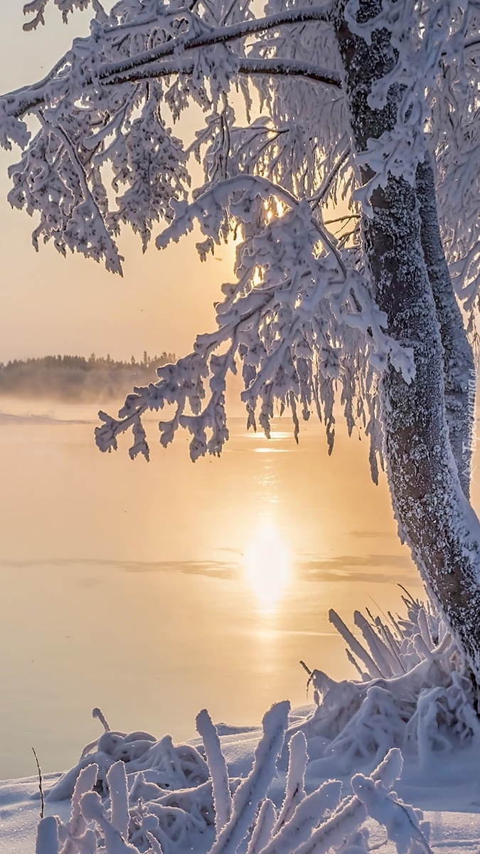 Edytor tapety: Ośnieżone drzewa na brzegu jeziora