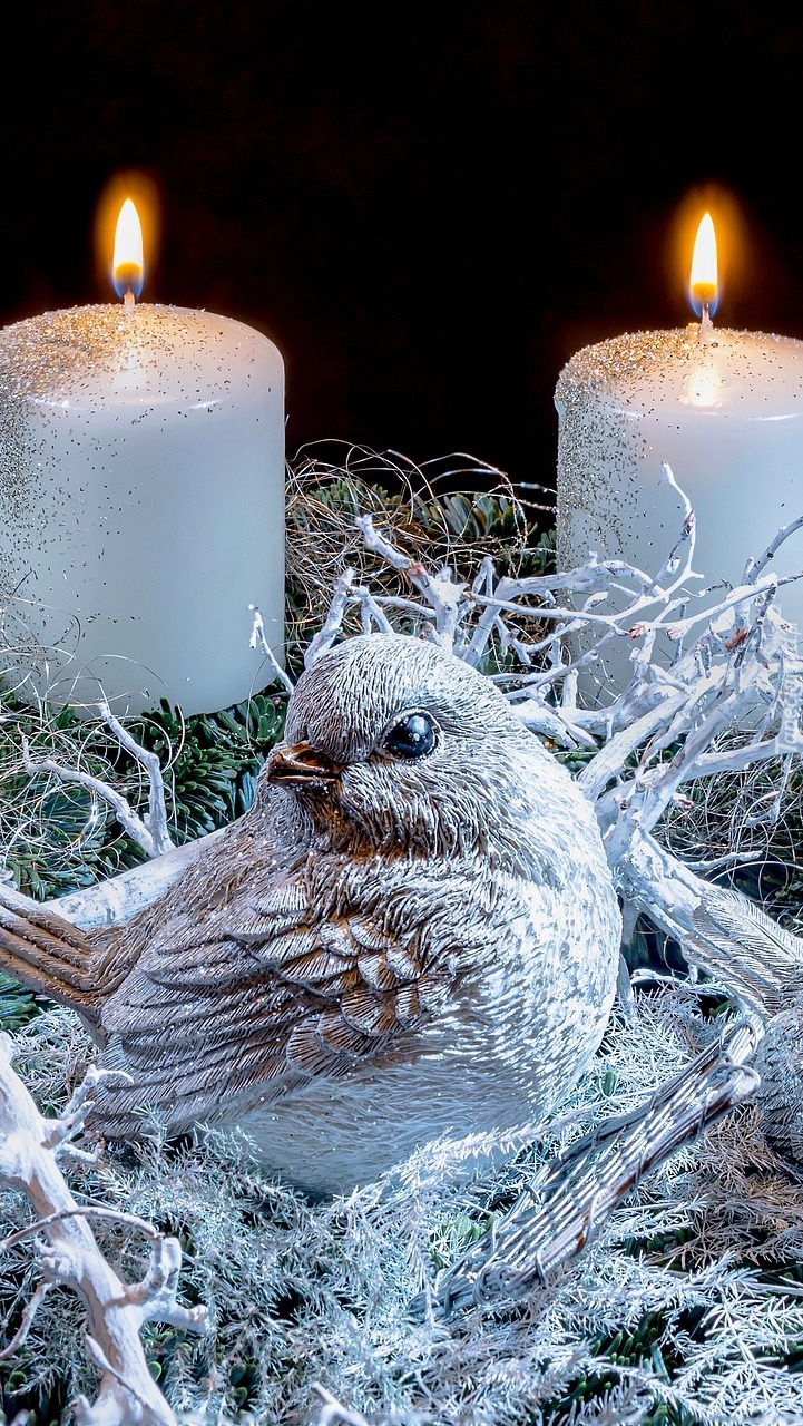 Edytor tapety: Figurka ptaszka przy zapalonych świecach